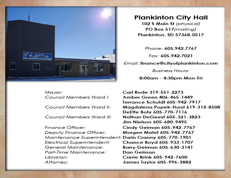 City Finance Officer, Cindy Geiman, manages the daily business of Plankinton City Hall. Utilities Superintendent, Chance Boyd and Maintenance Superintendent, Darin Cranny, manage city infrastructure development and maintenance, including electrical, streets and water utilities. Plankinton offers one of the lowest electrical rates in South Dakota through use of an innovative energy management system.